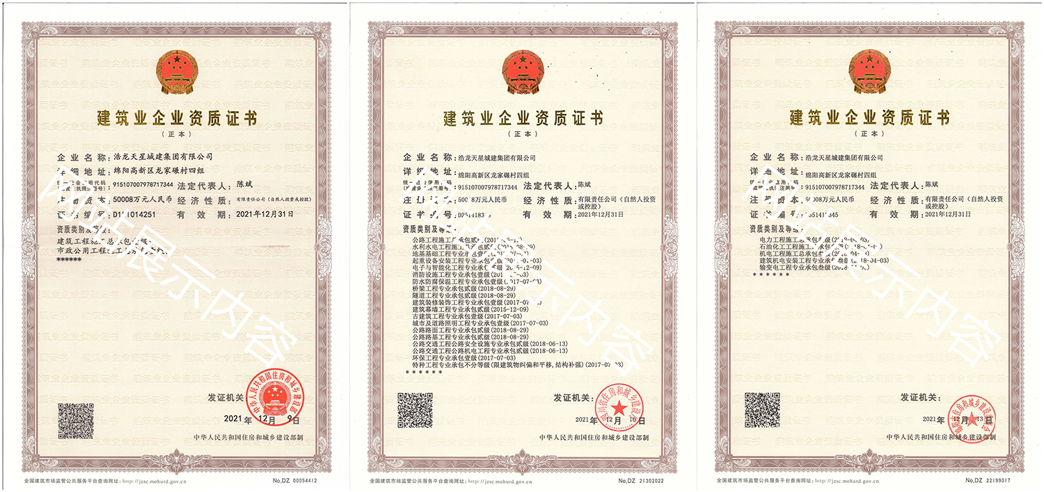 浩龍?zhí)煨浅墙瘓F(tuán)有限公司,2007年成立于“李白故鄉(xiāng)、中國(guó)科技城”—四川省綿陽(yáng)市,企業(yè)注冊(cè)資本金5.0008億元。公司共有27項(xiàng)建筑業(yè)企業(yè)資質(zhì),其中國(guó)家一級(jí)資質(zhì)11項(xiàng),二級(jí)資質(zhì)10項(xiàng),三級(jí)資質(zhì)5項(xiàng),特種資質(zhì)不分等級(jí)1項(xiàng),類(lèi)別涵蓋建筑、市政、水利、機(jī)電、隧道、起重設(shè)備安裝等基礎(chǔ)及未來(lái)發(fā)展重點(diǎn)專(zhuān)業(yè)。公司...